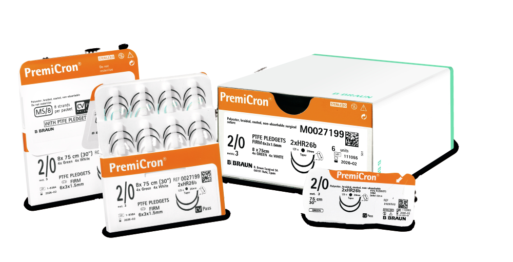 - PremiCron’s pledgets mechanically reinforce fragile tissues or prostheses preventing them from being torn or cut by the suture in cardiovascular surgery (e.g. valve replacement, cardiac injuries, ventricular septal defects) in combination with a non-absorbable suture.